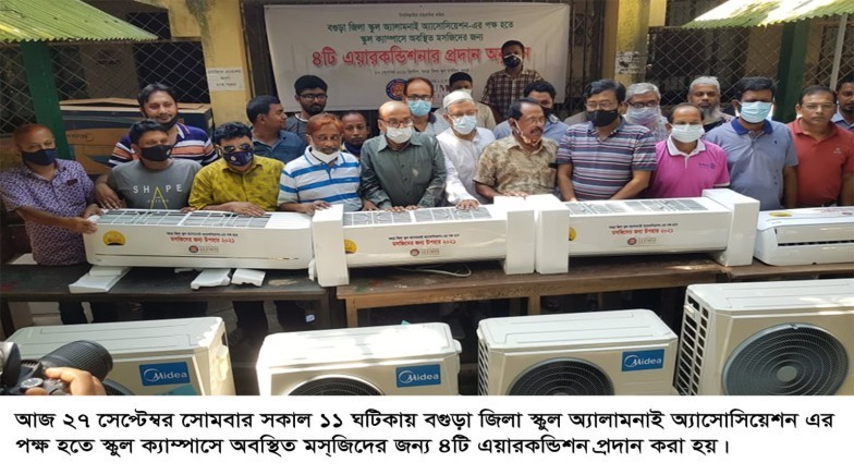 সমাজের প্রতি দায়বদ্ধতা এবং শিক্ষা প্রতিষ্ঠানের প্রতি গভীর ভালোবাসার বহিঃপ্রকাশ হিসেবে বগুড়া জেলা স্কুল এলামনাই অ্যাসোসিয়েশন আবারও এক উজ্জ্বল দৃষ্টান্ত স্থাপন করেছে। সম্প্রতি এই সংগঠনের পক্ষ থেকে বগুড়া জেলা স্কুল মসজিদে আধুনিক এয়ার কন্ডিশনার (এসি) বিতরণ ও স্থাপন করা হয়েছে, যা শিক্ষার্থী, শিক্ষক এবং মসজিদ ব্যবহারকারী সবার জন্য অত্যন্ত উপকারী ও সময়োপযোগী এক পদক্ষেপ।